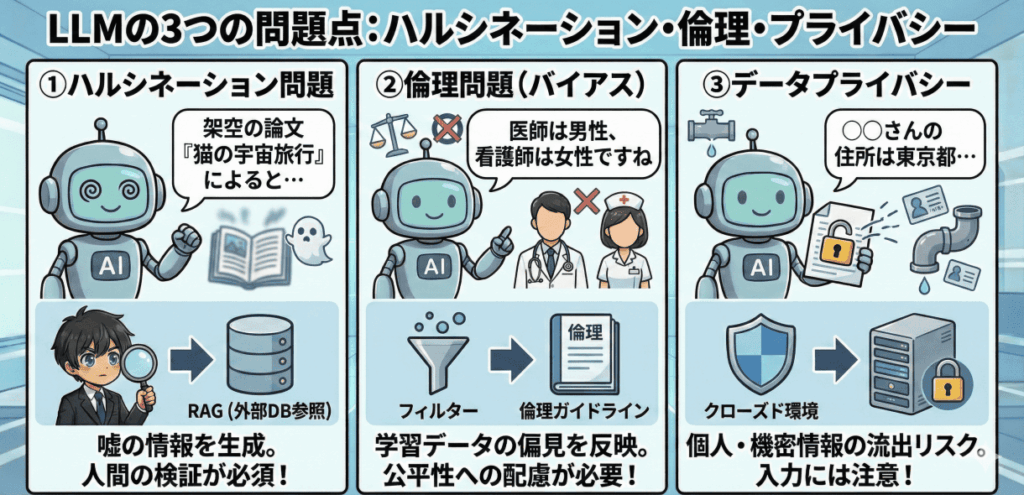 LLM(大規模言語モデル)は非常に便利で多機能なAIですが、いくつかの「課題」も存在します。ここでは、代表的な3つの問題点についてわかりやすく解説します。