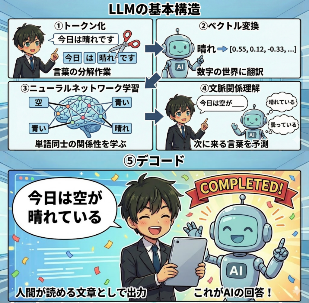 つまり、AIは トークン化 → ベクトル変換 → 学習 → 文脈理解 → 出力